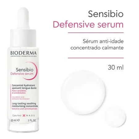 Sérum anti-idade concentrado calmante Bioderma Sensibio Defensive – Corrige rugas e previne o envelhecimento. O que acontece na sua pele? Todos os produtos dos Laboratórios BIODERMA são formulados de acordo com os princípios da eco biologia, que está no centro da estratégia da NAOS e cujo principal objetivo é respeitar o ecossistema da pele e preservar a sua saúde de forma duradoura. Bioderma oferece uma resposta eco biológica única e eficaz para as peles sensíveis e sensibilizadas. A tecnologia DEFENSIVE e o polímero de fucose dão à pele os meios para se defender do envelhecimento inflamatório. Atuam sobre as diferentes causas da sensibilidade e do envelhecimento prematuro, travando o círculo vicioso responsável pelo agravamento das peles sensíveis e do envelhecimento cutâneo. – Ação protetora : carnosina + vitamina E (um potente complexo anti-oxidante) protegem a pele dos radicais livres e das agressões externas. – Ação reforçadora : O tetrapeptídeo 10 estimula as proteínas e as enzimas envolvidas na proteção da epiderme, para combater as agressões que provocam o envelhecimento prematuro. Associado ao polímero de fucose, melhora a resistência. – Dupla ação calmante : os polifenóis da Salva Vermelha regulam a inflamação epidérmica induzida pela poluição e limitam a hiper-reatividade das fibras nervosas. O polímero de fucose completa a ação, actuando como um estimulante imediato e a longo prazo para reforçar a barreira cutânea e combater a inflamação crónica. Desenvolvido para ajudar a pele a regular a sua sensibilidade no quotidiano, o Sensibio Defensive Sérum ajuda a retardar o envelhecimento prematuro. Benefícios: – Corrige rugas e previne o envelhecimento – Peles sensíveis e sensibilizadas – Reduz as rugas e linhas finas. 4 – Acalma imediatamente a pele¹, deixando-a protegida² e hidratada por 24 horas³. – Deixa a pele fresca e mais brilhante4. – -84% rugas e linhas finas – Acalma a pele imediatamente hidrata a pele por 24 horas – Ação Antioxidante – Protege a pele das agressões externas – Textura ultraleve Para Quem? Adultos, adolescentes Tipo de Pele: Peles sensíveis e sensibilizadas Onde usar: Rosto e pescoço Resultados imediatos Pele Fresca, Luminosa e Confortável – Acalma: A pele sente-se confortável: 94% ¹ Intensidade das sensações desagradáveis: -82% em 3min ² Hidrata: Hidratação 24h ³ Luminosidade: Pele mais luminosa: 81% ¹ Resultados duradouros Redução das Rugas e Linhas Finas, Pele mais Lisa – Acalma: Pele acalmada: 96% 4 Fortalece: Pele mais resistente às agressões externas: 83% 4 Suaviza: Rugas e linhas finas reduzidas 4 Como Usar: Com a pele limpa, aplique o Sensibio Defensive Sérum de manhã e/ou à noite no rosto e pescoço, massageando suavemente a pele. Este produto foi formulado de acordo com o princípio de formulação positiva da NAOS. Em vez de cuidar excessivamente da pele, devemos ensiná-la a viver, fornecendo-lhe a dose justa dos ingredientes necessários e reativando os seus mecanismos naturais. No centro deste produto: Tecnologia Defensive Combinação exclusiva de ativos que acalma, hidrata e fortalece as defesas da pele contra agressões do dia a dia e poluição, agindo nas causas externas e internas da reatividade para tornar a pele mais protegida e resistente. Patente D.A.F.™ O estresse externo pode tornar a pele reativa e sensível. Esse complexo patenteado aumenta o limiar de tolerância da pele – independentemente do tipo de pele – para fortalecer a sua resistência. Instruções de reciclagem: Produtos Eco-design: trabalhamos diariamente na melhoria contínua dos nossos produtos de forma a minimizar o seu impacto ambiental. A maioria dos nossos produtos é feita de plástico 100% reciclável e todas as caixas exteriores são 100% recicláveis e de papel de florestas geridas de forma sustentável. Instruções de classificação: consulte as instruções de classificação para reciclar o seu produto da forma mais adequada.